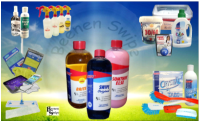 Handelsonderneming Beenen Swipe levert milieu vriendelijke schoonmaak producten onder de naam HomCare, de bekendste hiervan is o.a. de milieu vriendelijke allesreiniger de Blauwe Swipe. |